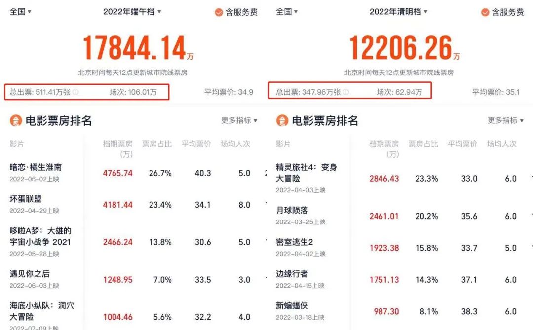 當然,如果考慮到近期電影市場的客觀影響因素。今年端午檔三天時間總出票量達511.41萬張,總場次106.01萬場,相比同為三天假期的清明節(jié)來說已經(jīng)回升了不少。