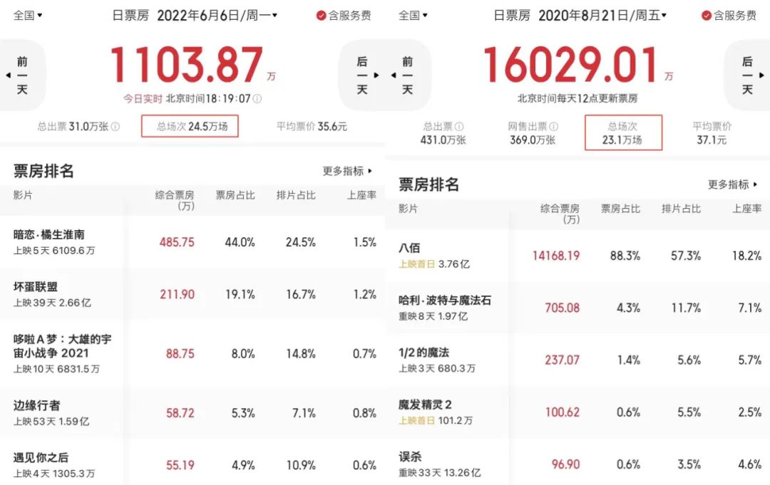 要知道在兩年前復工初期,《八佰》首映日的全國當日場次數(shù)量還不及2022年6月6日一個普通周一多。眼下最大的問題已經(jīng)變成了缺片少片,而非不可抗力因素。