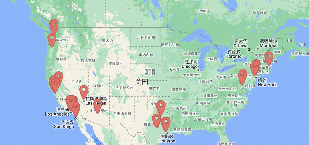 根據品牌美國網站的官方信息,目前線下可購買的點位主要集中在西海岸加州、華州、德州和部分東海岸城市,中部、北部基本尚未大規(guī)模涉獵。