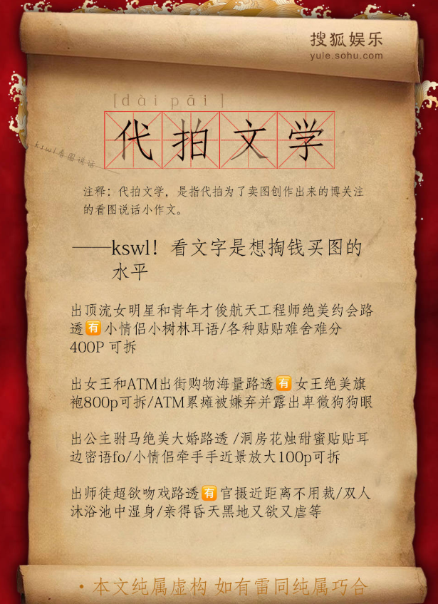原來,清晰且角度完美的路透圖是粉絲的最愛,現(xiàn)在,只有代拍“小作文”寫得好,才有可能收割好韭菜。如今,代拍小作文更是演變成“代拍文學(xué)”這一網(wǎng)絡(luò)用語,并形成獨(dú)特的表達(dá)話術(shù)。