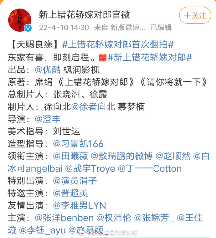 還有一部經(jīng)常用來打臉當(dāng)今古偶的“網(wǎng)紅老劇”《上錯花轎嫁對郎》。原以為2021年李庚希那部《花好月又圓》就是它的翻拍新版,哪知今年4月,又有一部新版《上錯花轎》開機(jī),還打上“首次翻拍”的tag,兼有老版主演隔空站臺。