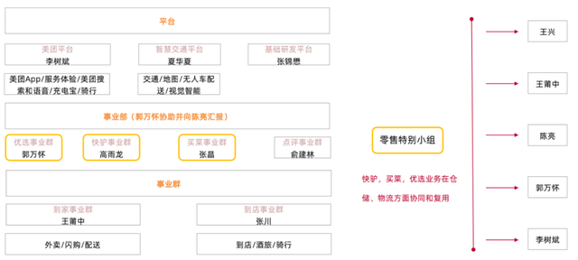 去年9月,美團(tuán)正式將戰(zhàn)略從“Food+Platform”升級(jí)為“零售+科技”,之后一個(gè)月,又進(jìn)行了一次特別人事調(diào)整,由王興、王莆中、李樹(shù)斌、郭萬(wàn)懷、陳亮五人組成了零售特別小組,展示美團(tuán)押注零售的野心。