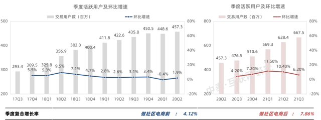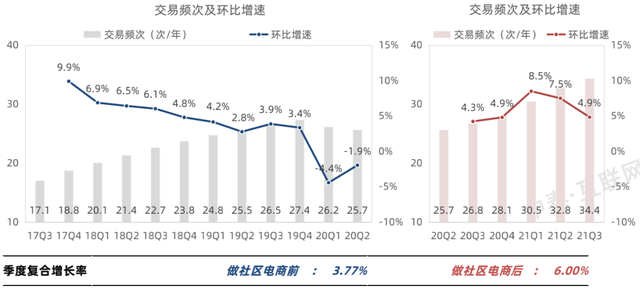 對(duì)比美團(tuán)在做社區(qū)電商前與社區(qū)電商后的用戶增長(zhǎng),季度的復(fù)合增長(zhǎng)率呈現(xiàn)成倍增長(zhǎng)的趨勢(shì)。