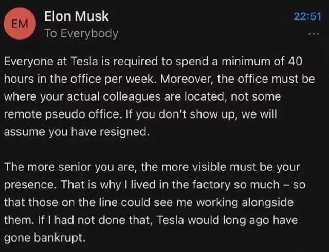 但規(guī)律也有反例。比如萬億市值的特斯拉毫無疑問是一家一流企業(yè),但如今他們的CEO馬斯克正在抓考勤。6月1日,馬斯克通過內(nèi)部郵件發(fā)布通知,要求員工盡快結(jié)束居家辦公,回辦公室上班,且每周必須在辦公室待夠40個小時。他的口氣頗為嚴厲:“如果你不來,我們就認為你已經(jīng)辭職了?!?/p>