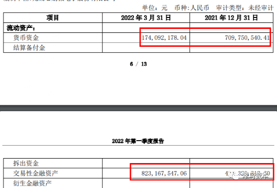到了2022年3月末,貨幣資金減少至1.74億元,而交易性金融資產(chǎn)規(guī)模在短短3個月時間里從4.28億元暴增至8.23億元,幾乎翻倍。