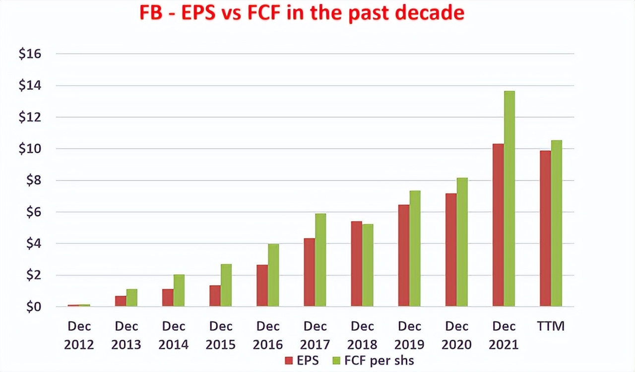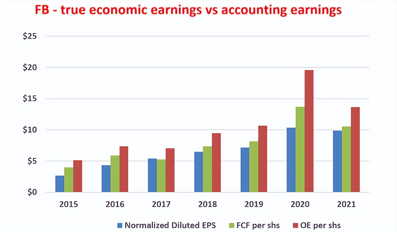 在此背景下,下圖顯示了FB近年來的真實經(jīng)濟收益與會計EPS和FCF的對比。這張圖表的主要觀察結果是:
