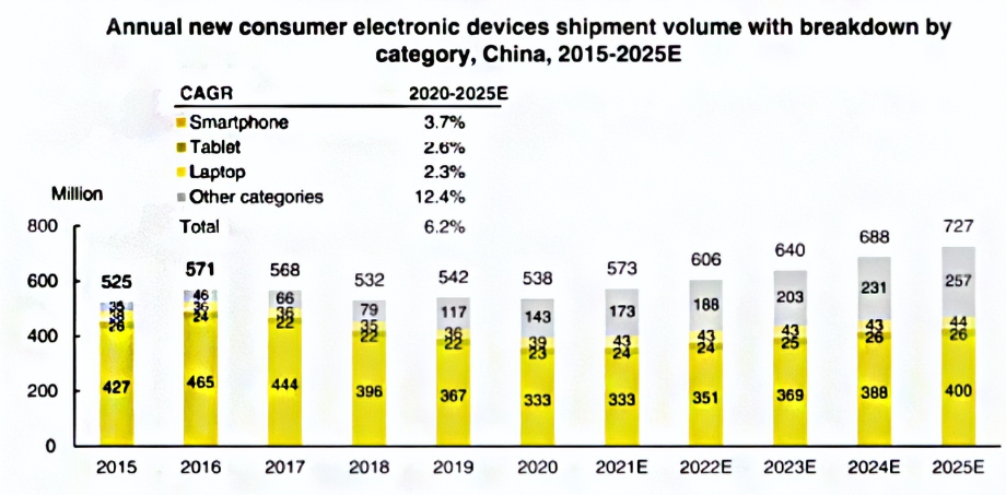 據(jù)灼識咨詢(CIC)報告數(shù)據(jù)顯示,從市場規(guī)模來看,2020年中國消費電子產(chǎn)品銷售額達1.9萬億元,預(yù)計2025年將達到2.97萬億元,年復(fù)合增長率達9.3%。整體而言,消費電子呈現(xiàn)出蓬勃之勢,市場的火熱也在一定程度上帶動了3C配件產(chǎn)業(yè)的發(fā)展。