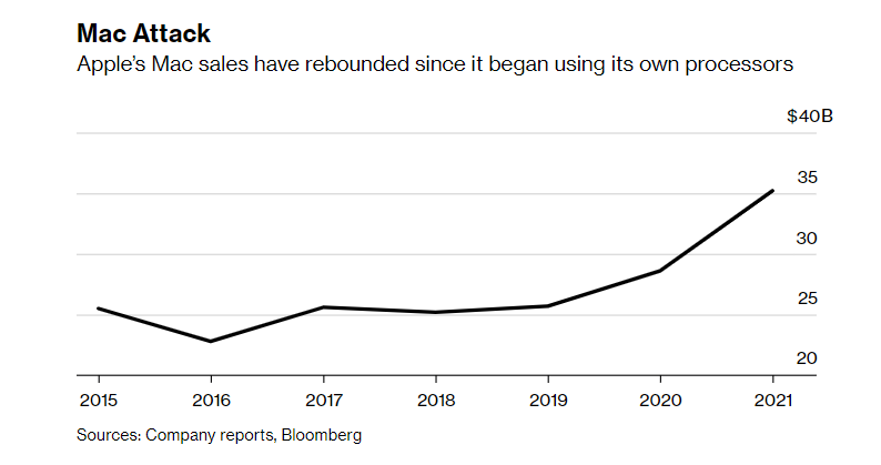 蘋(píng)果Mac電腦銷(xiāo)售額走勢(shì)圖,來(lái)源:彭博社