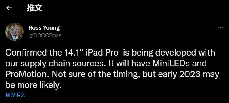 至于發(fā)布時(shí)間,Ross Young認(rèn)為新款14英寸iPad Pro在2023年年初發(fā)布的可能性更大。
