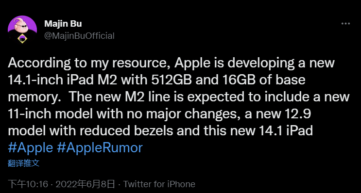 此外,據(jù)推特爆料人Majin Bu透露,這款14.1英寸iPad Pro將會(huì)搭載M2芯片,并配備了512GB存儲(chǔ)和16GB內(nèi)存。