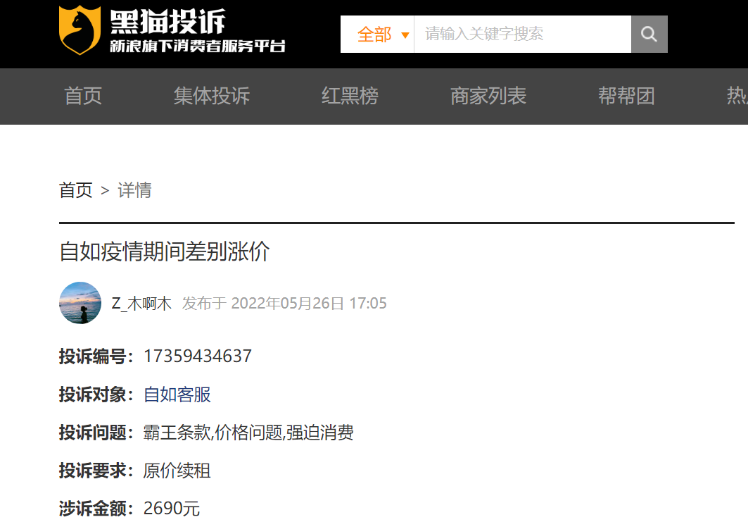對此,自如方面稱,由于業(yè)主新合約、市場供求顯著上漲導致租金上漲。用自如管家的原話來回答:“這個價格是系統(tǒng)自動生成的,是系統(tǒng)自動根據(jù)周邊房價調(diào)整后的價格?!边@樣的說法,自如租客們顯然不滿意。新浪旗下消費者投訴平臺黑貓投訴上顯示,租客對自如的漲價投訴幾乎是每周都有新發(fā)現(xiàn),“續(xù)租按漲價價格來”“霸王條款漲價”“一周漲價”“強迫消費”等投訴應接不暇。