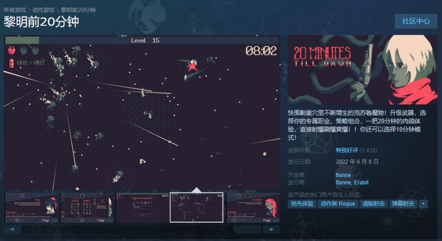 就在上周,一款風(fēng)格化明顯的獨(dú)立游戲《黎明前20分鐘》一經(jīng)發(fā)售就獲得的玩家一致好評(píng)。以紅黑為主的畫面配色讓人一眼印象深刻,極簡(jiǎn)風(fēng)格的生存玩法融合了清版射擊,技能組合以及類Rogue隨機(jī)元素,讓這款“類吸血鬼”獨(dú)游瞬間脫穎而出,在Steam不僅獲得了開局96%的好評(píng),這款游戲上線首日就已經(jīng)突破了10萬的銷量,妥妥的獨(dú)游爆款。
