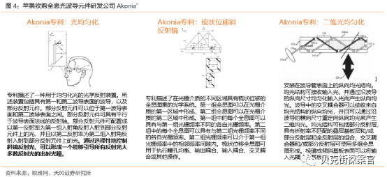 早在2010年便不斷收購(gòu)與 VR 和 AR 相關(guān)的技術(shù)以及企業(yè),進(jìn)行 AR/VR 設(shè)備的專利布局,包括但不限于近眼顯示、虛擬顯示傳感器、虛擬顯示感知交互技術(shù)、虛擬顯示抬頭顯示導(dǎo)航(HUD)及其他導(dǎo)航等相關(guān)專利,而且蘋果2018年還收購(gòu)了AR 眼鏡專用鏡片的初創(chuàng)公司 Akonia Holographics。