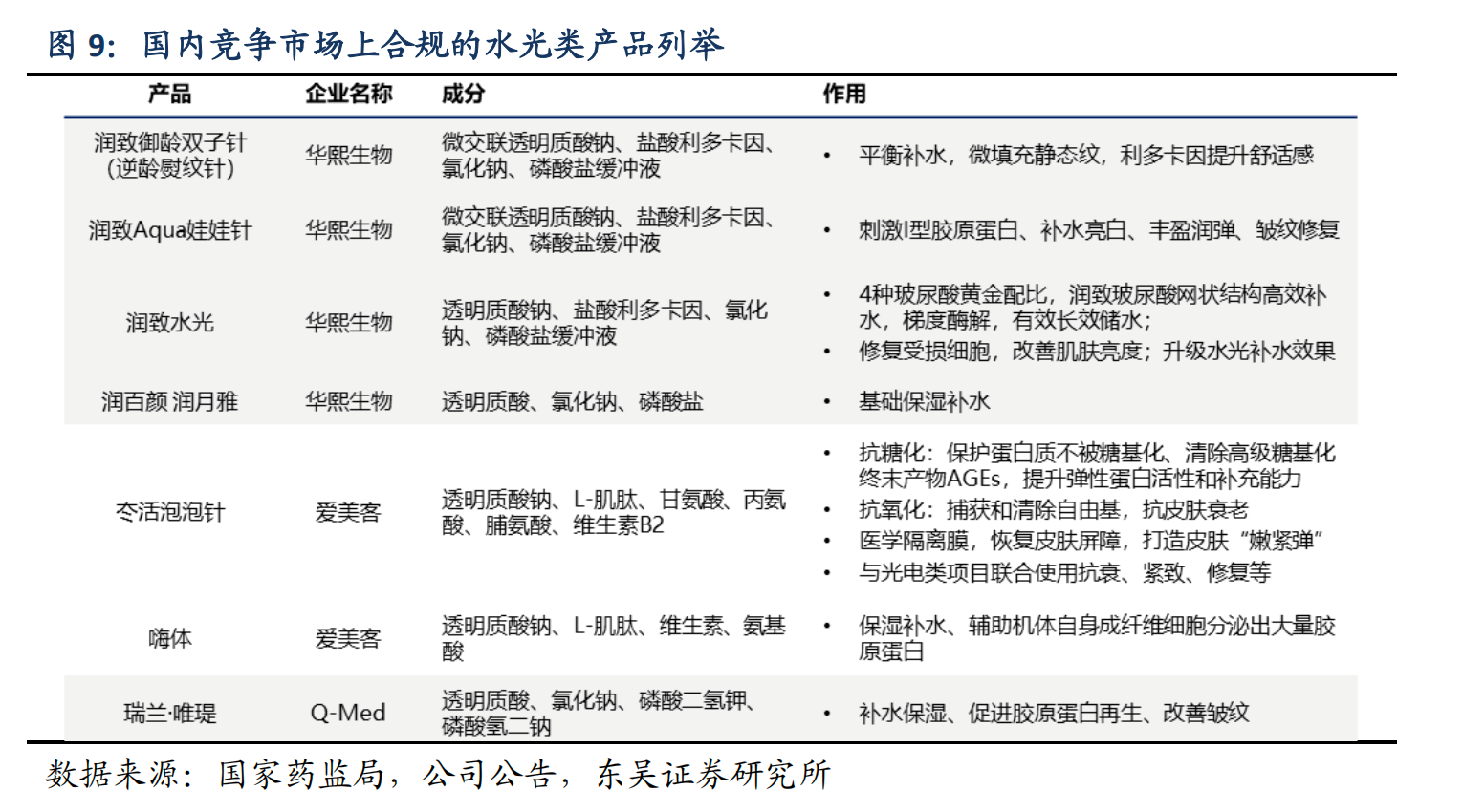 2022 年 3 月,國家藥監(jiān)局正式發(fā)布“關(guān)于調(diào)整《醫(yī)療器械分類目錄》部分內(nèi)容”的公告,明確作為“水光針”主要成分的注射用透明質(zhì)酸鈉溶液按照Ⅲ類醫(yī)療器械監(jiān)管。用于注射到真皮層,主要通過所含透明質(zhì)酸鈉等材料的保濕、補水等作用,改善皮膚狀態(tài),產(chǎn)品不應(yīng)含有發(fā)揮藥理學(xué)、免疫學(xué)或者代謝作用的成分。而目前醫(yī)美市場上獲得三類器械證的水光針產(chǎn)品尚少,以愛美客、華熙生物上市公司的產(chǎn)品為代表。而其中,例如愛美客嗨體、冭活泡泡針這類含營養(yǎng)素的水光針更加稀缺。在政策監(jiān)管趨嚴之下,醫(yī)美機構(gòu)正逐步轉(zhuǎn)向使用正規(guī)持證產(chǎn)品,這將為愛美客、華熙生物等公司產(chǎn)品帶來可觀的增量空間。