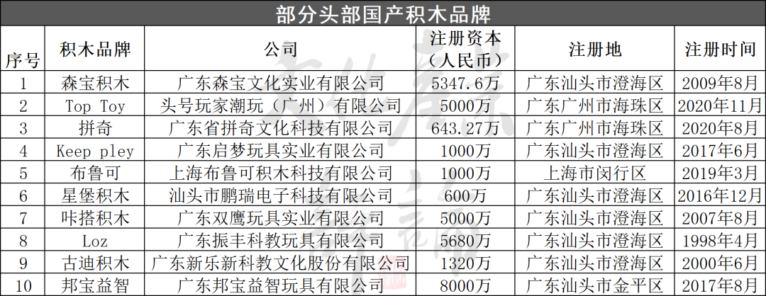 由筆者梳理的部分頭部國產(chǎn)積木品牌(如上表)可見,這些品牌注冊資本在600萬到8000萬人民幣不等。其中,森寶作為近年來崛起的積木老大,于今年2月已獲得A輪融資,投資方包括阿里巴巴、頭頭是道基金和弘暉資本。創(chuàng)立于2003年的森寶在2012年以前主要靠代工為主,2012年,森寶進(jìn)入積木品牌賽道時,也是樂高大舉投資中國之年。