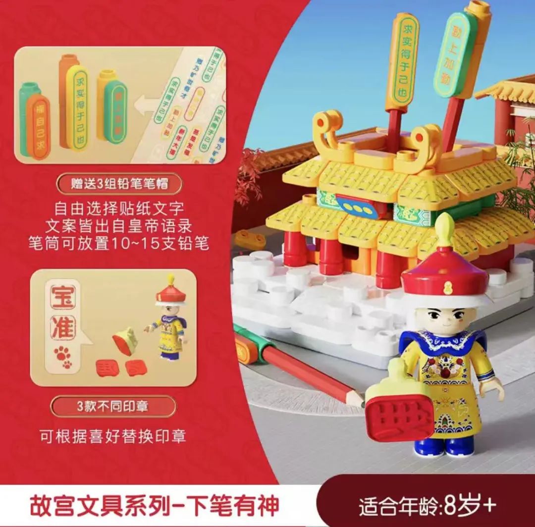 布魯可故宮文化聯(lián)名系列積木就推出了實(shí)用與審美相結(jié)合的“新文房三寶”文具系列?!跋鹿P有神”一款把富麗堂皇的迷你版皇家宮殿模型與筆筒結(jié)合,自由選擇的貼紙文案則皆出自皇帝語錄。