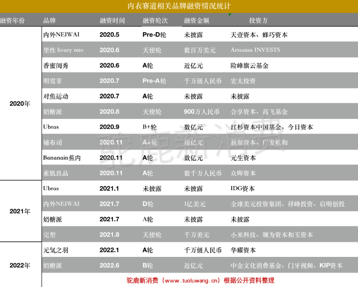 據(jù)駝鹿新消費不完全統(tǒng)計,最近三年,國內(nèi)內(nèi)衣賽道共發(fā)生16起融資事件,從已披露的融資金額來看,幾乎每起都動輒千萬。在資本的推動和精準的營銷下,眾多新銳品牌在消費市場破圈而出,如Ubras、內(nèi)外、奶糖派等。