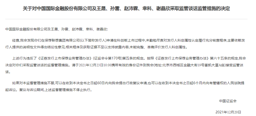2021年12月29日,證監(jiān)會通報稱,決定對中金公司及王晟、孫雷、趙沛霖、幸科、謝晶欣5名保代采取監(jiān)管談話的監(jiān)督管理措施,因后者在保薦聯(lián)想集團(0992.HK)申請在科創(chuàng)板上市過程中,5名保代未勤勉盡責,對其科創(chuàng)屬性認定履行充分核查程序,主要依賴其提供的說明性文件得出結論性意見,相關程序及獲取證據(jù)不足以支持披露內容,未能完整、準確評價其科創(chuàng)屬性。