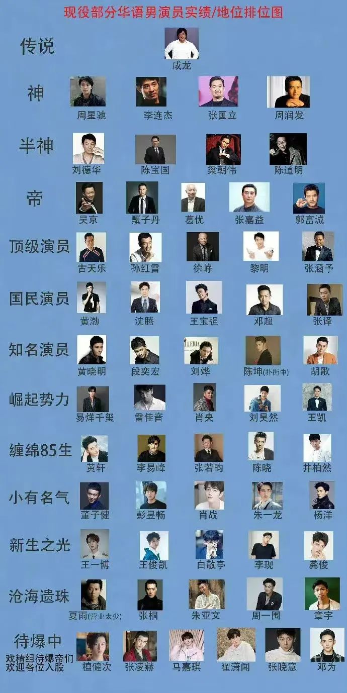 比如這波有人針對演員群體制榜,把華語男演員分為傳說、神、半神、帝、頂級演員、國民演員、知名演員、崛起勢力、纏綿85生、小有名氣、新生之光、滄海遺珠、待爆中等梯度等級,榜單洋洋灑灑列了近50多位藝人,此榜單無疑可幫助影視劇組借衡量角色適配度、片酬預算與演員性價比,從而挑選到合適的演員合作。