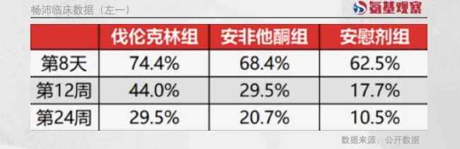 根據(jù)伐倫克林與安非他酮的頭對頭實(shí)驗(yàn)來看,伐倫克林兩更勝一籌。如下圖所示,在用藥第8天、12周以及24周三個階段,伐倫克林組“戒斷率”均高于安非他酮組。