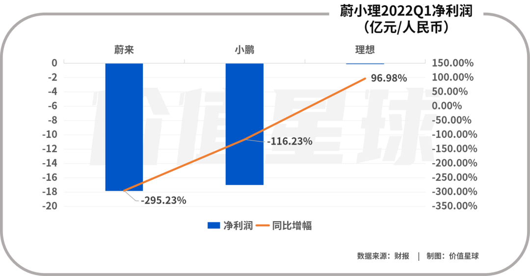 2022年第一季度,蔚來、小鵬、理想分別承受了17.83億元、17.01億元和0.11億元的凈虧損。蔚來和小鵬的凈利潤同比降幅分別為295.23%和116.23%,而理想雖然在本季度沒有實(shí)現(xiàn)凈盈利,卻實(shí)現(xiàn)了96.98%的凈利潤增幅。