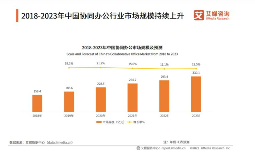 iiMedia Research(艾媒咨詢)數(shù)據(jù)顯示,2021年中國(guó)協(xié)同辦公市場(chǎng)規(guī)模達(dá)264.2億元。預(yù)計(jì)2021-2023年,中國(guó)協(xié)同辦公行業(yè)將保持每年10%以上的增長(zhǎng)率,2023年的市場(chǎng)規(guī)模將達(dá)330.1億元。