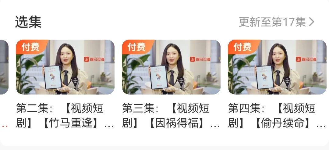 當(dāng)然,喜馬拉雅也不是第一個“吃螃蟹的人”。此前,快手就率先上線了付費(fèi)功能,設(shè)置官方賬號“快手付費(fèi)內(nèi)容助手”;隨后,抖音也數(shù)次嘗試過短劇付費(fèi),并且進(jìn)行了試水;而騰訊視頻與微視也上線了單劇付費(fèi)的功能,從內(nèi)容上都是以甜寵劇為主,從形式上都是以微短劇為主。