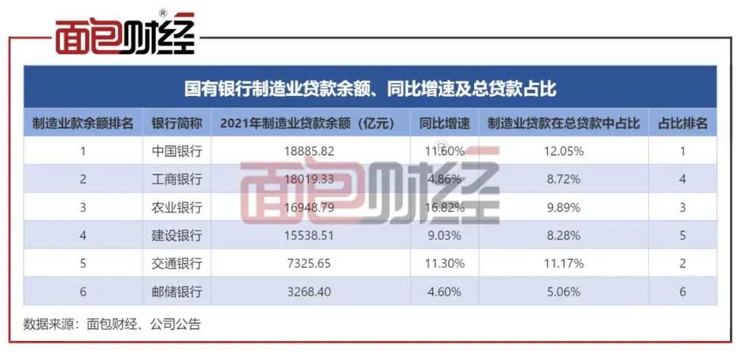 年報(bào)數(shù)據(jù)顯示,截至2021年末,農(nóng)業(yè)銀行的制造業(yè)貸款約為1.69萬億元,較上年增加2440.63億元,增幅為16.82%。與其他國(guó)有銀行相比,該行的制造業(yè)貸款規(guī)模小于中行和工行,位居第三位,但增速在國(guó)有行中最高。