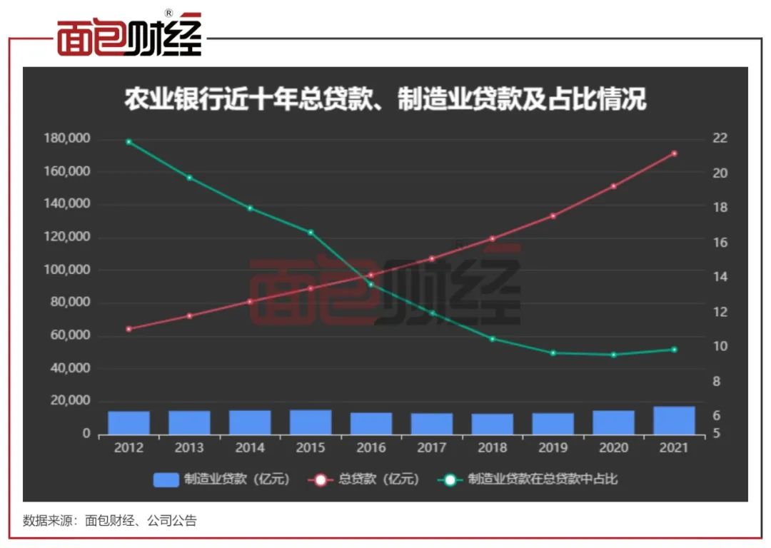 但值得注意的是,從近十年數(shù)據(jù)來看,農(nóng)業(yè)銀行的制造業(yè)貸款規(guī)模整體保持增長(zhǎng)趨勢(shì),但總貸款占比由2012年的21.85%降至2021年9.89%,10年間下降11.96個(gè)百分點(diǎn)。雖然2021年該行的制造業(yè)貸款有所回升,但仍不及2018年的占比水平。
