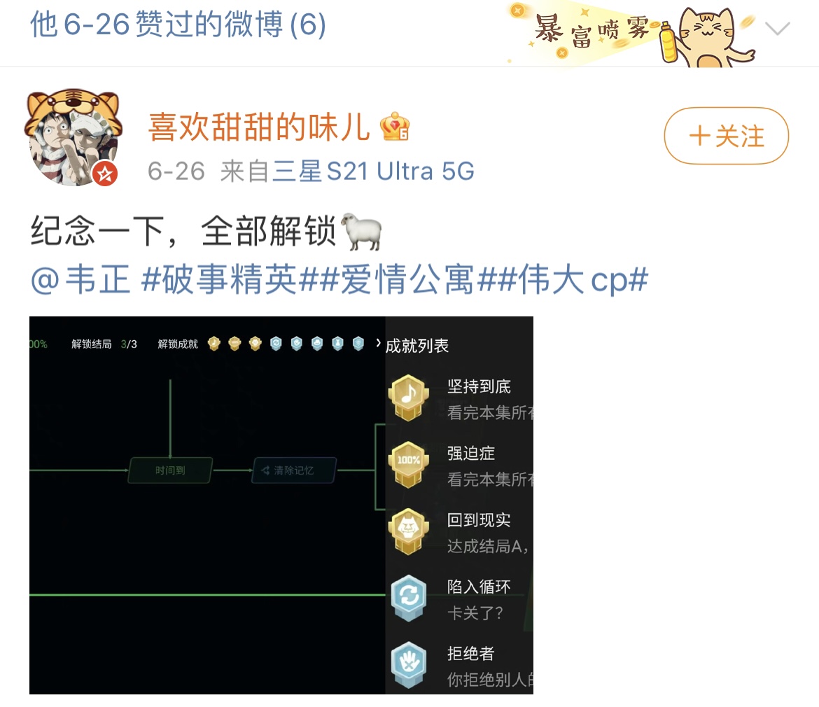 此外,《破事精英》還上線了互動視頻成就體系,通過各類成就勛章引導(dǎo)觀眾持續(xù)互動探索。已經(jīng)有觀眾“求攻略”,《虛擬伴侶》的觀看體驗(yàn)也更加類似游戲體驗(yàn)。