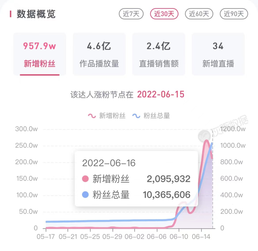 但是,抖音上到底什么會(huì)火?怎么做才火?這是一個(gè)仁者見(jiàn)仁智者見(jiàn)智的話題,俞敏洪在宣布轉(zhuǎn)型的半年中,也一直探索答案。據(jù)相關(guān)數(shù)據(jù)顯示,半年之前,東方甄選開(kāi)啟了抖音直播,粉絲量從0到100萬(wàn)花了近六個(gè)月的時(shí)間,但最近一周的時(shí)間,直播間從100萬(wàn)到360萬(wàn),只用了不到一周的時(shí)間,現(xiàn)在直播間累計(jì)粉絲量超過(guò)1000萬(wàn)。而GMV一直在幾十萬(wàn)左右徘徊,但是,6月10日,東方甄選破圈之后,GMV迅速破千萬(wàn),熱度從抖音直播帶貨榜200多名躍升到頭部。