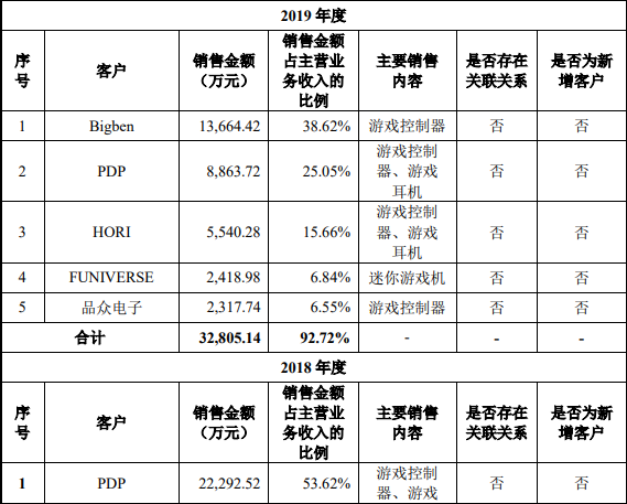 景創(chuàng)科技2019與2018年度的前五大客戶