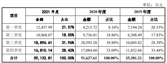 2019-2021年度景創(chuàng)科技主營業(yè)務(wù)收入分季節(jié)列示