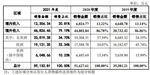景創(chuàng)科技的產(chǎn)品主要是外銷,2021年度北美收入占比34.7%、歐洲收入占比32.34%,都超過了境內(nèi)收入。