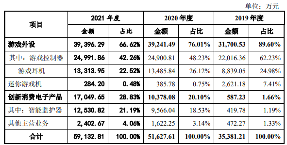 景創(chuàng)科技的迷你游戲機業(yè)務(wù)收入,也從2018年的6803.11萬元減少至2021年的284.2萬。