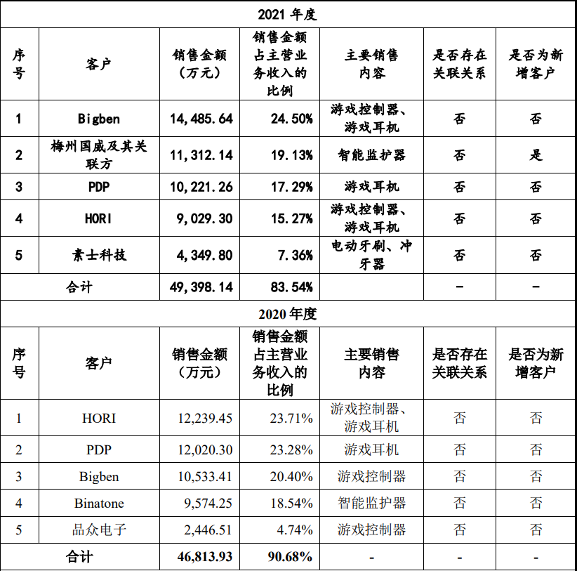 景創(chuàng)科技2021與2020年度的前五大客戶
