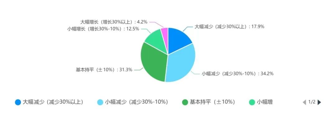 凈利潤方面。17.9%的商家上半年同比減少30%以上,34.2%的商家同比減少10%-30%。與營收情況相似的是,有近兩成商家上半年凈利潤同比增長,4.2%的商家增幅在30%以上。此外,約3成商家凈利潤基本持平去年。
