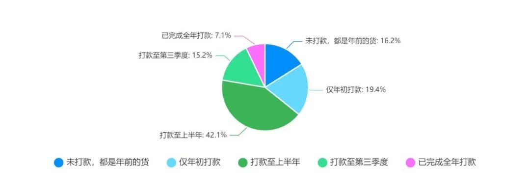 打款方面。16.2%的商家今年至今為止未打款,目前動銷的均是年前的貨,19.4%的商家僅年初打款,42.1%的商家完成半年打款。與此同時,超過兩成商家積極備貨,有7.1%的商家完成全年打款,15.2%的商家打款完成三季度打款。
