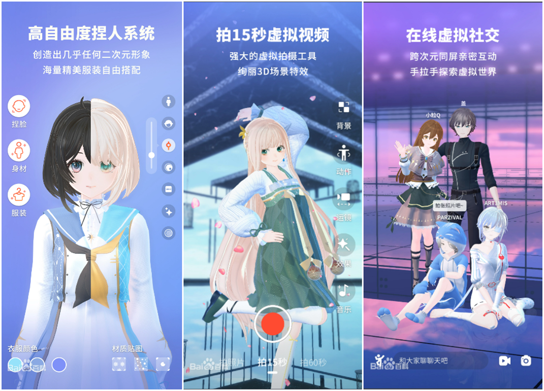 在波粒子推出的首款虛擬社交軟件“Vyou微你”中,用戶可以通過3D捏臉換裝功能,創(chuàng)建自己的虛擬形象,通過手機前置攝像頭及麥克風(fēng)捕捉面部表情及聲音,并與虛擬世界中的好友進行合影等社交互動。
