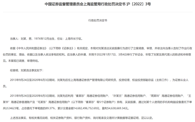 七年間,先后任職海通證券資產(chǎn)管理有限公司(下稱“海通資管”)研究員、投資經(jīng)理、權(quán)益投資部副總監(jiān)(主持工作)的劉某,通過多個馬甲股票賬戶違規(guī)下單2萬多筆,違法炒股交易超過146億元,盈利5464萬元,近日被上海證監(jiān)局罰沒超1億元,創(chuàng)近年自然人罰金記錄。