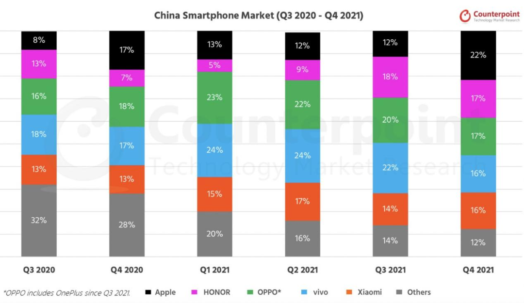 蟄伏了三個季度后,榮耀在去年第三季度緩了過來,迅速重返國內(nèi)市場。從Counterpoint公布的2020Q3至2021Q4間的六個季度數(shù)據(jù)可以明顯看到,截至去年12月31日,市場份額已經(jīng)與OPPO不相上下。