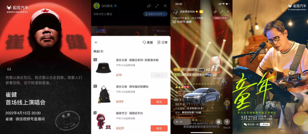 歷經(jīng)4次實操,當下視頻號演唱會與品牌主的聯(lián)動營銷日臻成熟。最早(4月15日)極狐汽車冠名崔健演唱會,被認為是線上演唱會領域首次招到冠名商,據(jù)悉,那場演唱會冠名費用在千萬元級別,極狐借全場Logo露出累計收獲9000萬用戶觸達,極狐微信指數(shù)峰值較活動前提升54倍、達歷史最高。