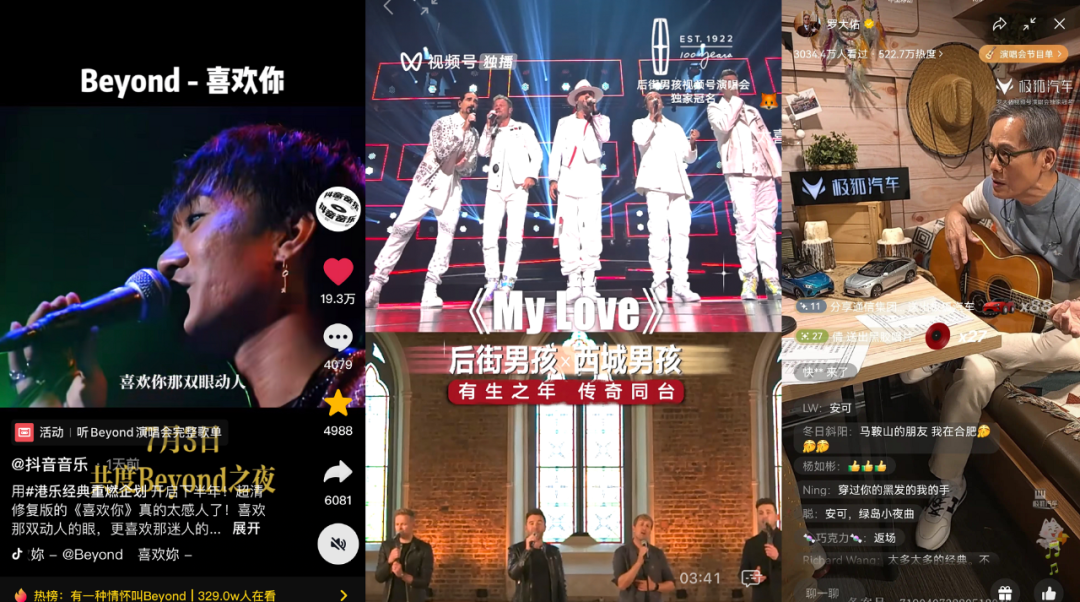 可以看到,相比一個多月前(5月27日),抖音攜“孫燕姿線上唱聊會”與視頻號“羅大佑首場線上演唱會”同天對壘,這一次,抖音在企劃思路上進一步與視頻號趨同。Beyond這場盛會被抖音稱之為“港樂經(jīng)典重燃企劃”的開端,這與520時TME live借周杰倫演唱會發(fā)布的“奇跡現(xiàn)場重映計劃”項目相似度極高。