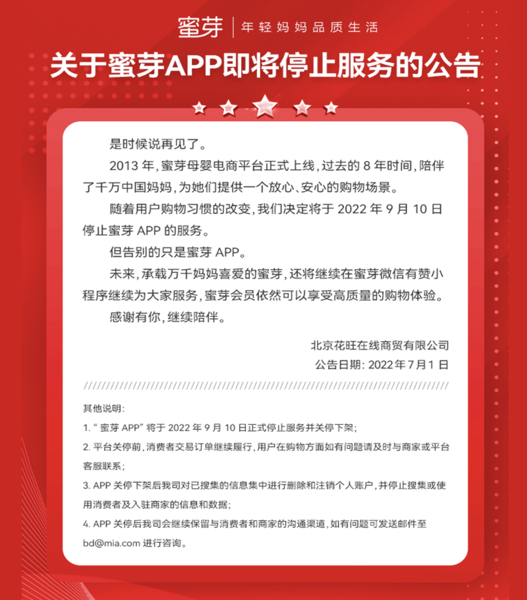 近日,母嬰商城蜜芽App發(fā)布停服公告稱,將于2022年9月10日停止服務(wù)。根據(jù)公告,停運(yùn)的只有蜜芽App,蜜芽將在微信有贊小程序繼續(xù)提供服務(wù),蜜芽會(huì)員依然可以享受購物體驗(yàn)。
