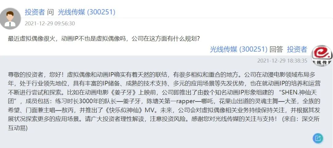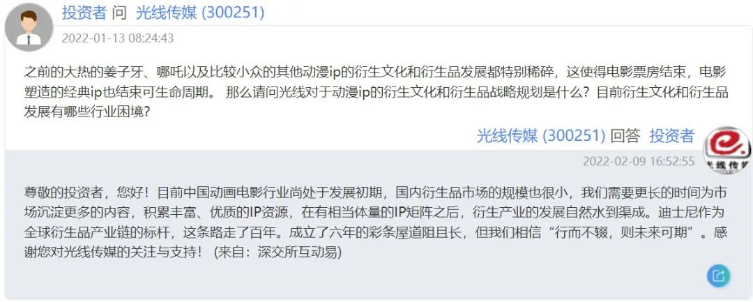 投資者互動(dòng)平臺(tái)是一個(gè)普通股民與上市公司互動(dòng)交流、進(jìn)行信息溝通的渠道。只需要簡單注冊,就可以向上市公司提出相關(guān)問題,上市公司人員會(huì)站在官方角度進(jìn)行回復(fù)。絕大多數(shù)股民針對影視公司提出的問題都與公司業(yè)績、電影上映時(shí)間等相關(guān),而針對動(dòng)畫電影這塊的問題就非常有意思了,包括電影過審進(jìn)度,到上線檔期推薦,再到衍生品布局,ACG產(chǎn)業(yè)鏈上下游的相關(guān)問題,都深受股民關(guān)心。