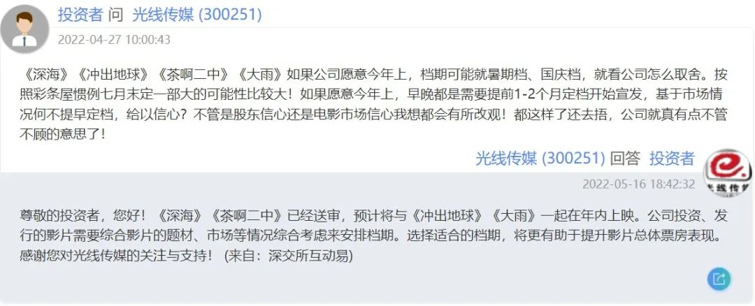 在投資者互動(dòng)平臺(tái),有股民曾希望光線傳媒能夠?qū)ⅰ稕_出地球》或《深海》在2022年春節(jié)檔上映,還希望能夠效仿漫威做“封神宇宙”,甚至有建議光線收購追光動(dòng)畫的。今年5月,有股民詢問《深?!贰稕_出地球》何時(shí)上映,而光線傳媒也終于給出了答復(fù):《深海》《茶啊二中》已經(jīng)送審,預(yù)計(jì)將與《沖出地球》《大雨》一起在年內(nèi)上映。