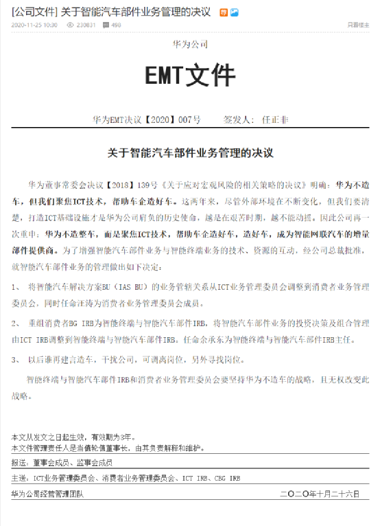 按照余承東所述,華為決定當(dāng)?shù)闷稹奥殬I(yè)鯰魚”的稱號(hào)。而且根據(jù)華為心聲社區(qū)2020年11月流出的《關(guān)于智能汽車部件業(yè)務(wù)管理的決議》,華為不造車的承諾期限為3年,換言之,2023年11月后,華為就有可能跨入整車制造業(yè)。