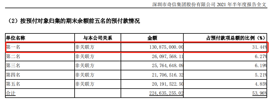 奇信股份2021年半年報中“按預(yù)付對象歸集的期末余額前五名的預(yù)付款情況”顯示,第一名的預(yù)付款金額正是1.31億元,占預(yù)付款項總額的比例為31.44%。當(dāng)時奇信股份稱該“第一名”為非關(guān)聯(lián)方。