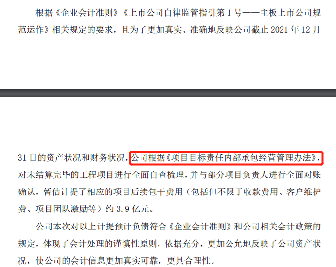 奇信股份在回復(fù)函中表示,根據(jù)《項目目標(biāo)責(zé)任內(nèi)部承包經(jīng)營管理辦法》,對未結(jié)算完畢的工程項目進(jìn)行全面自查梳理,并與內(nèi)部承包人進(jìn)行對賬確認(rèn),將已經(jīng)支付的項目后續(xù)包干費用 9.56 億元與暫估計提的項目后續(xù)包干費用(包括但不限于收款費用、客戶維護(hù)費、項目團(tuán)隊激勵等) 3.9 億元合計 13.46 億元計入了2021 年度“管理費用”。