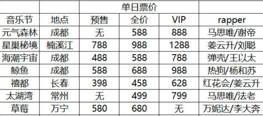 無獨有偶,有網(wǎng)友查閱了近來大麥等平臺開售的多城市音樂節(jié)票價,500左右票價檔位(預(yù)售價580、588、788起)的比比皆是,多場演出VIP票價更是飆升到在千元附近徘徊。咱就是說,現(xiàn)在看場音樂節(jié)的票價快趕上周杰倫演唱會了?